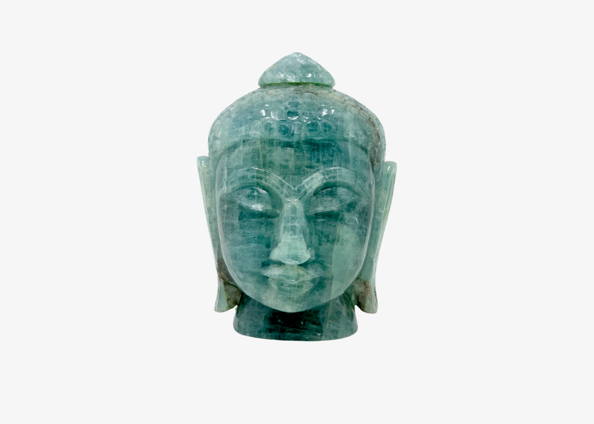 An extremely rare Buddha head statue hand carved from an entire piece of aquamarine crystal by artist Ram Kumar. This piece is as much as 15.5 cm height and 1.7 gm weight. An aquamarine crystal of this size comes up only once in three years, making this piece priceless. It is said that contemplating on a Buddha statue, helps to awaken the divine energy within us.