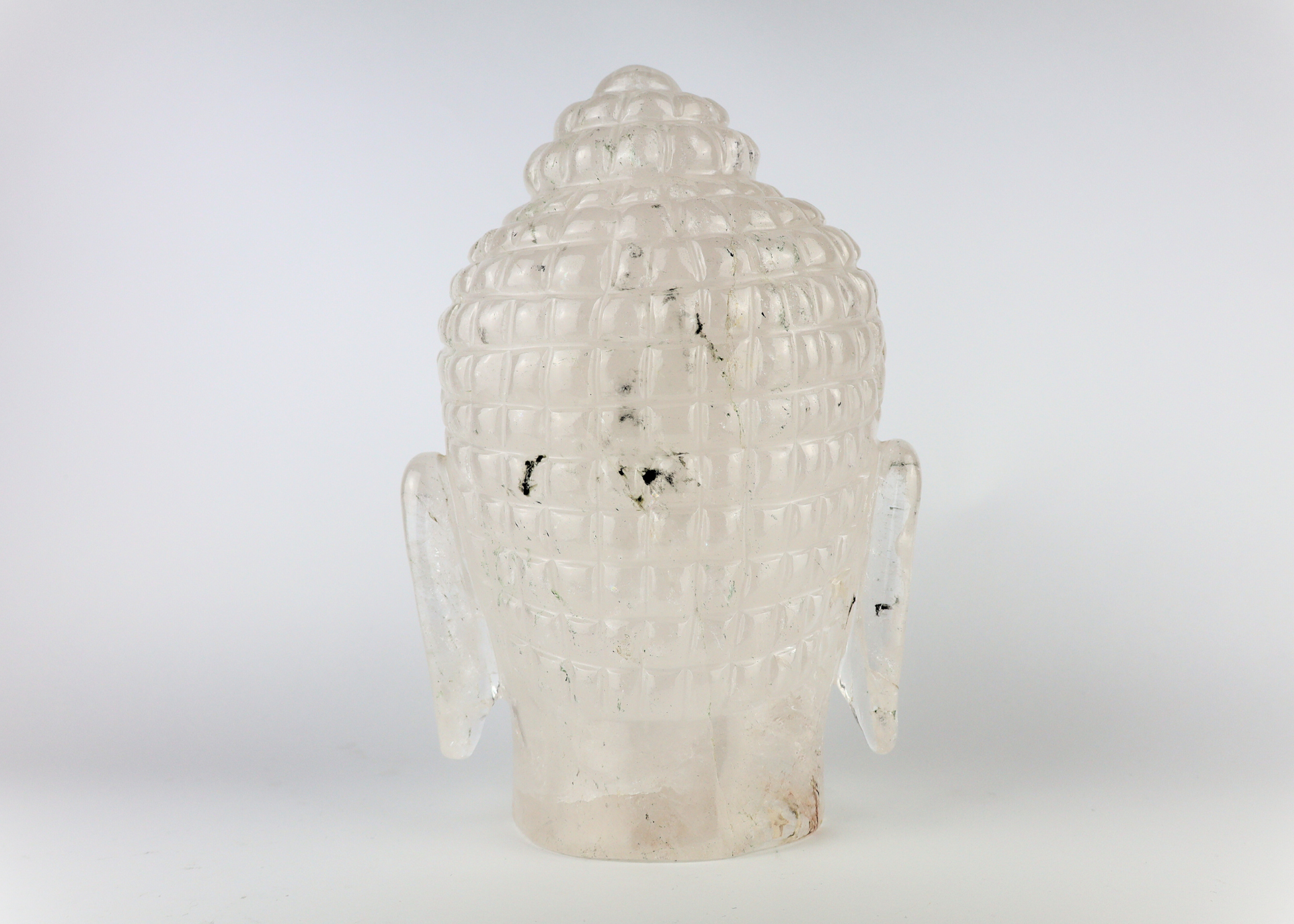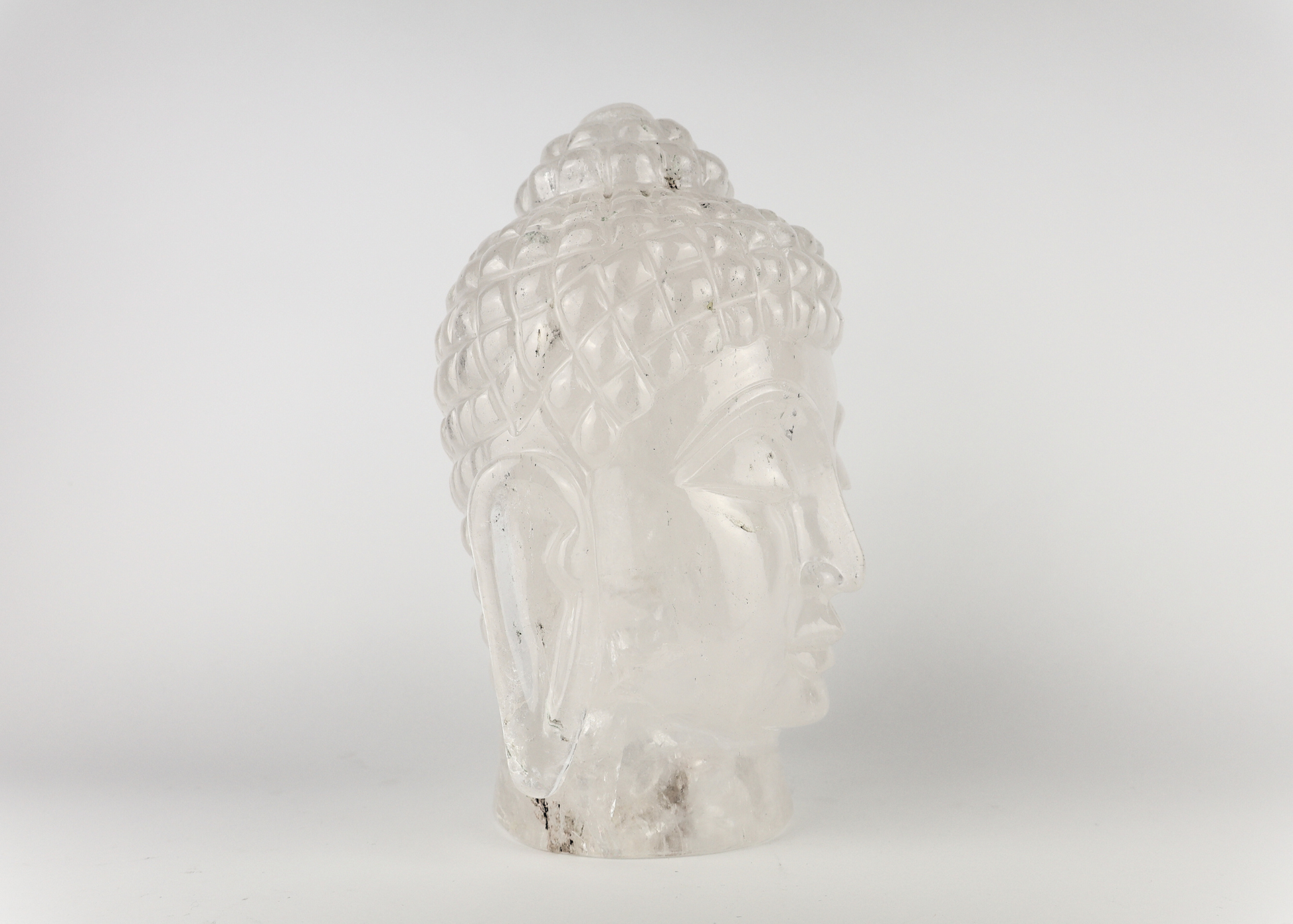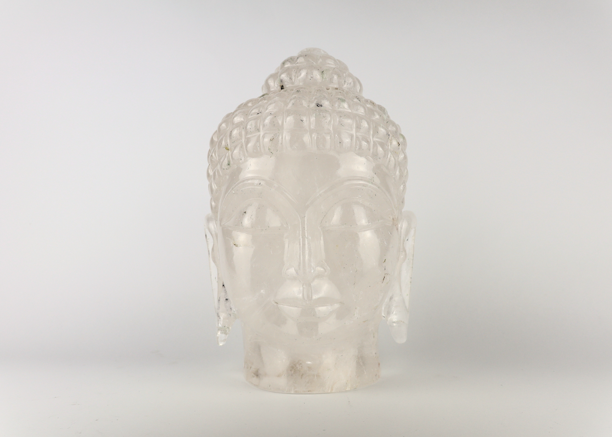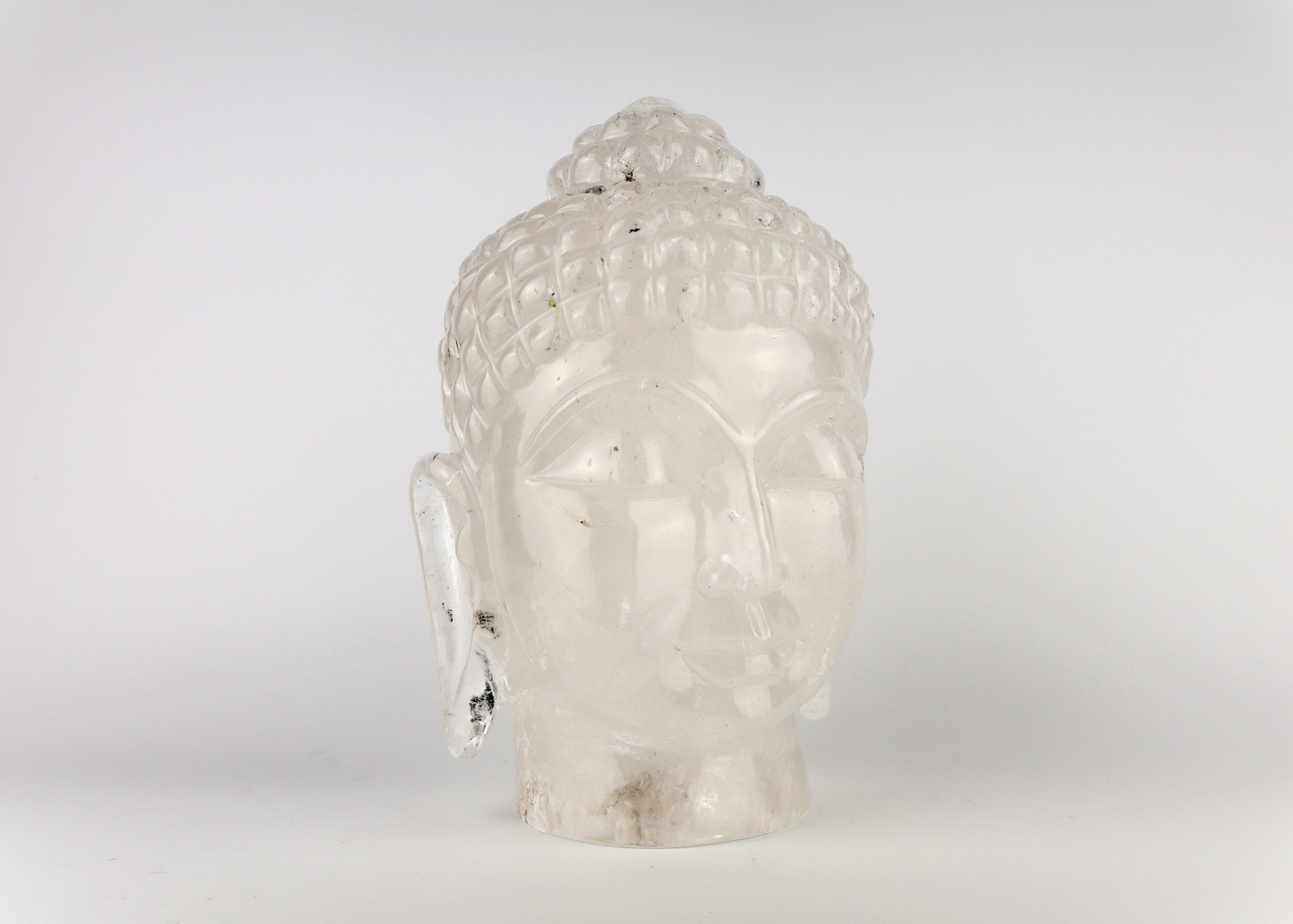 A stunning Buddha Head in precious Clear Quartz. The Buddha Head is a popular representation of the Buddha and his characteristics. Statues of Buddha Heads are created to represent the vast wealth of knowledge he possessed, being the awakened one. The elongated earlobes represent the Buddha’s ability to hear or perceive reality as it is, and serve as a reminder of the renunciation of the wealth he was once weighed down by.