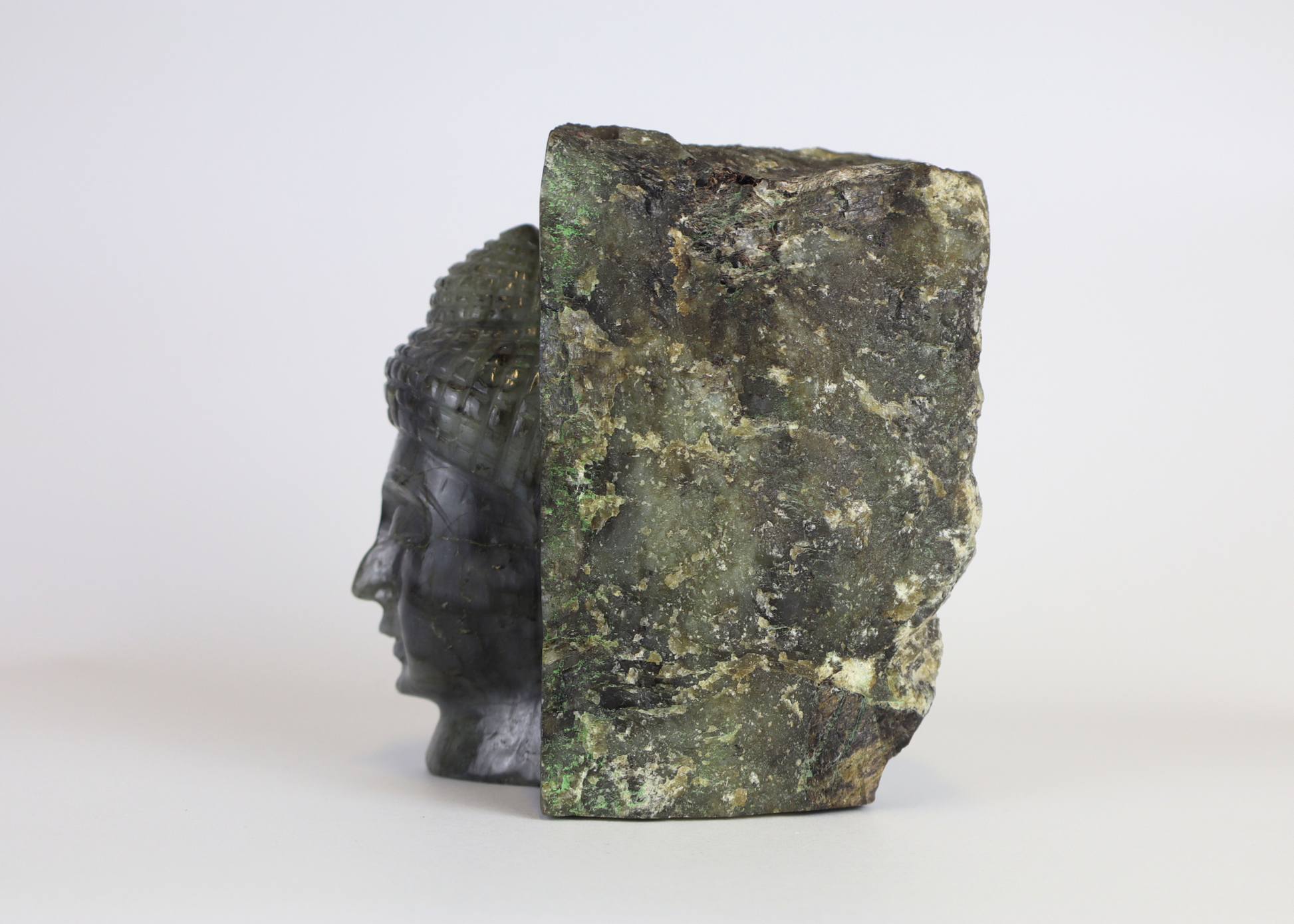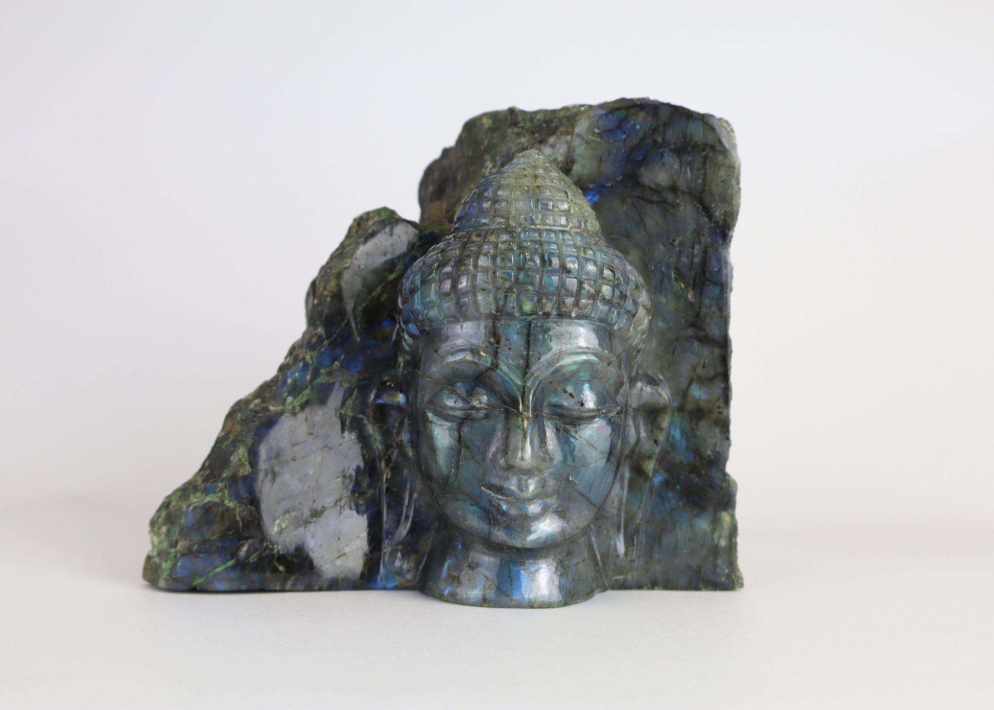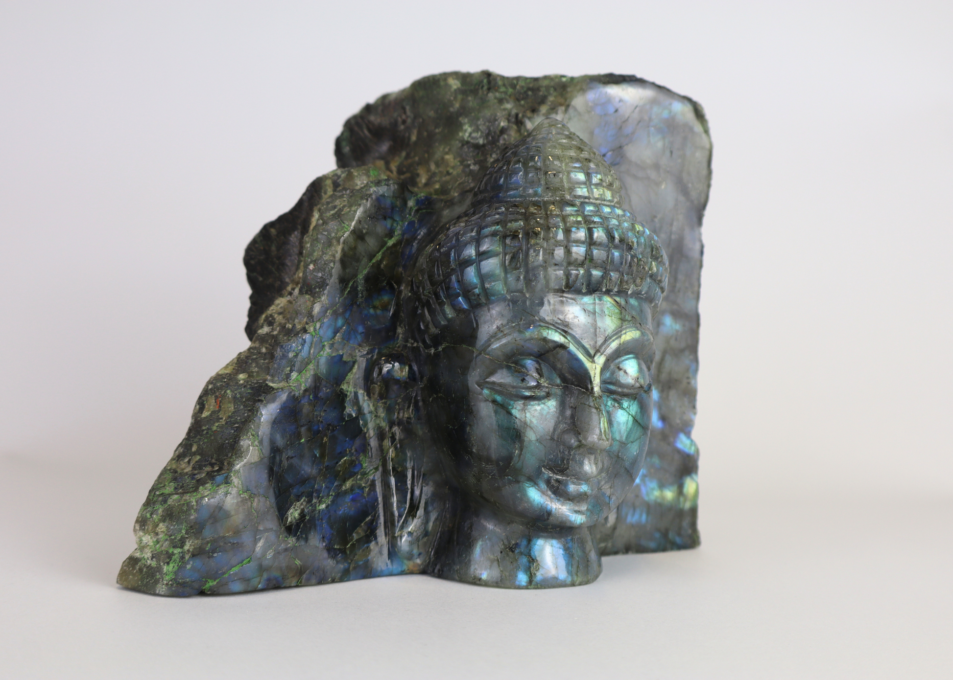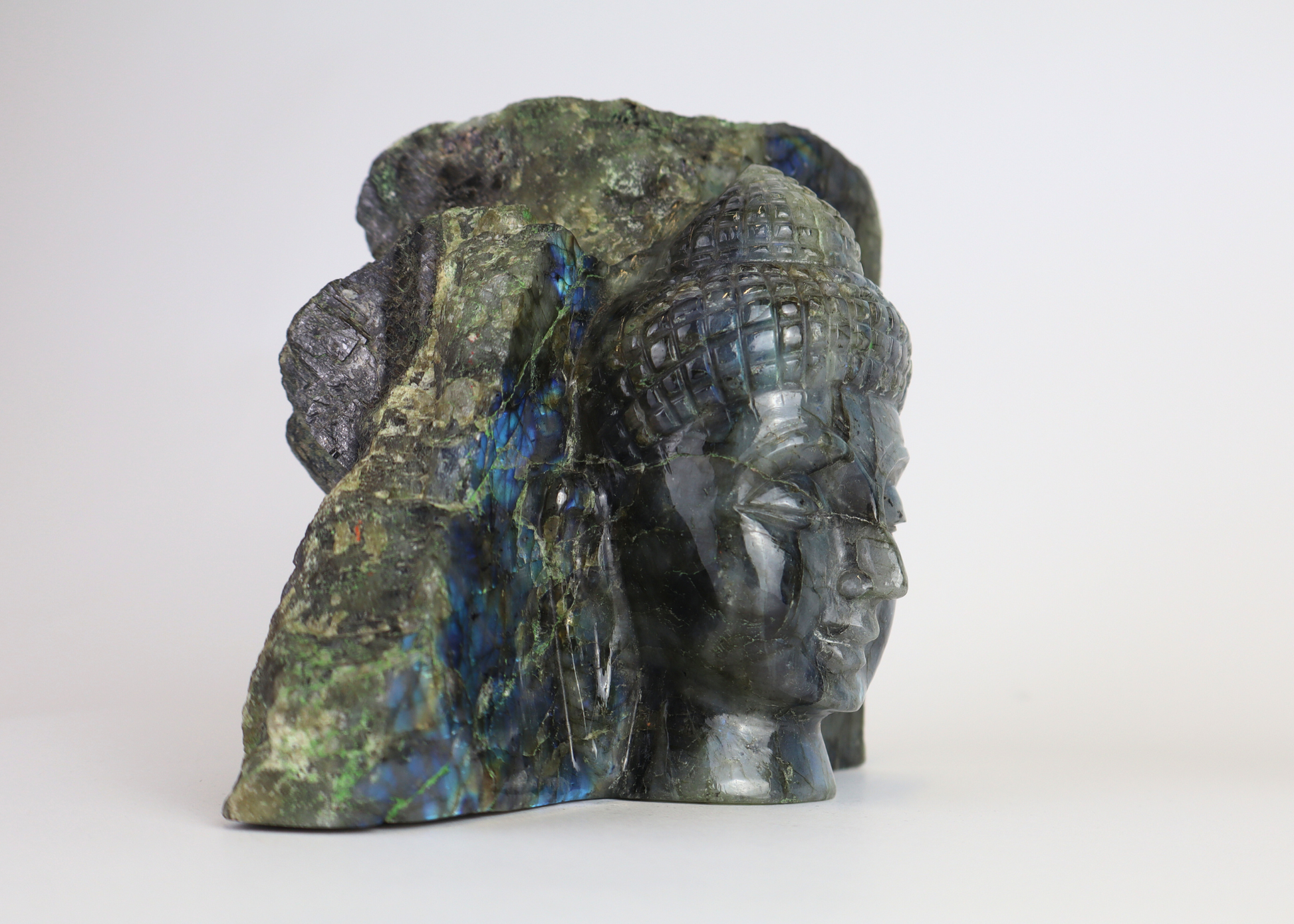 This particular Buddha head is masterfully carved from labradorite, with the serene, symmetrical features emerging from a substantial section of raw, untouched stone. The polished face reflects perfect form and harmony, symbolising the balance between Yin and Yang, the feminine and masculine energies. Behind it, the rough labradorite retains its natural ruggedness, catching the light with flashes of iridescent blues, greens, and golds—echoing the stone’s association with mystical insight, hidden truths, and spiritual transformation. To the artist, this union of raw and refined form mirrors the spiritual journey itself: awakening arises not from perfection alone, but from embracing both the polished and untamed aspects of our being.