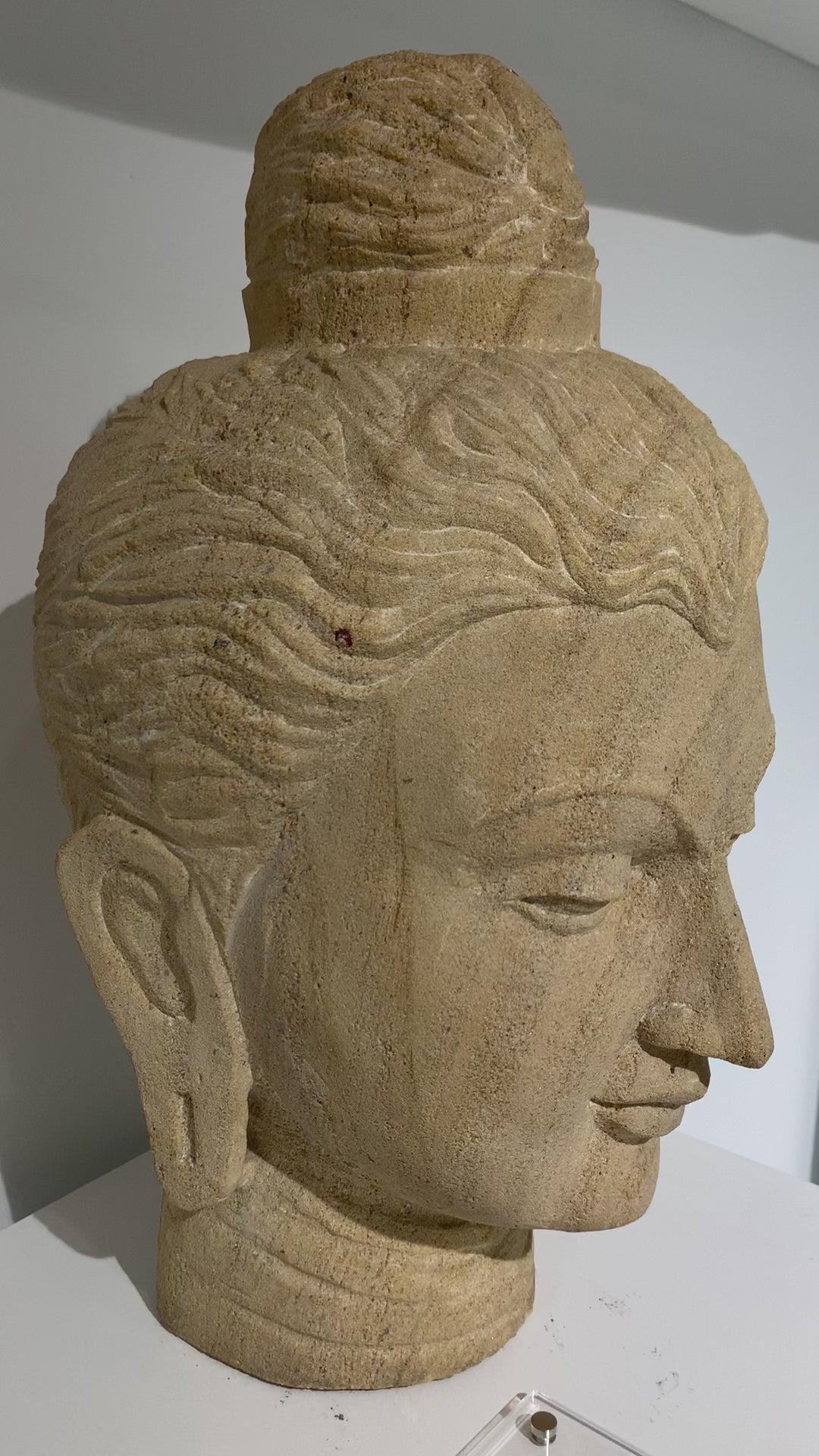 One of our masterpieces, a Buddha Head handmade from sandstone by artist R. Mani. This particular piece is done in Gandhara style, an art technique that emerged during Kushan dynasty. This style was strongly influenced by Hellenic style and is famous for use of ancient Greek techniques. Looking at Buddha’s youthful face, curly hair, his features resemble closely those of Greek and Roman Gods.