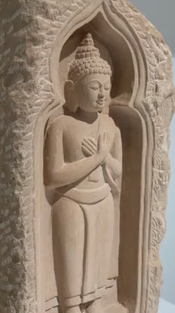 Inspired by ancient images of Buddha found in world famous caves of Ellora and Ajanta, R. Mani recreated this image of Shakyamuni Buddha carved entirely within Sandstone, as if taken from the cave. Influenced by native Indian style, the artist left the back of the stone untouched, preserving the rough finish, as found in Mother Nature. Looking at this masterpiece we are taken back into ancient times, marvelling at the glory of Indian artistic heritage. Indeed, it is R. Mani's tribute to the ancient treasures of Indian art and architecture.