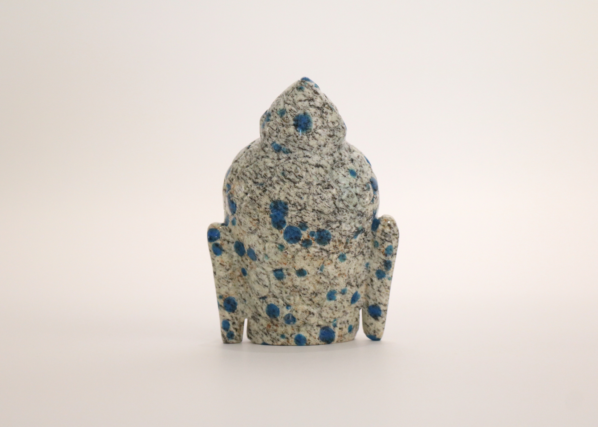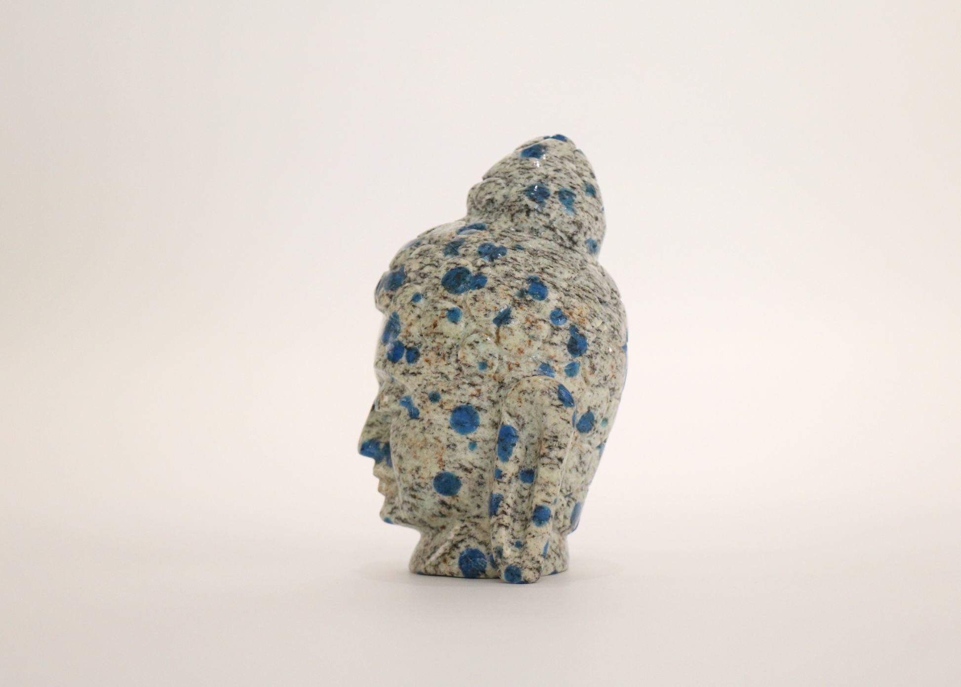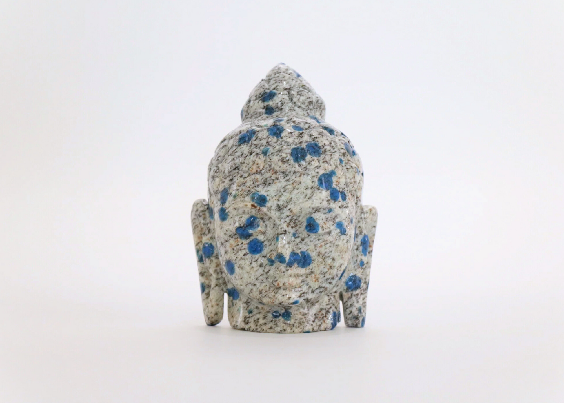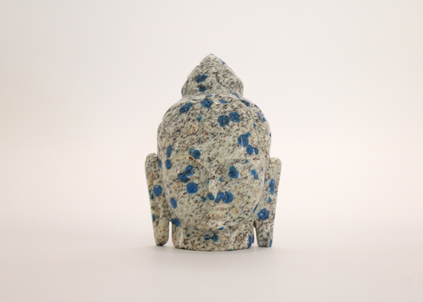 A stunning Buddha Head in precious K2 Jasper (also known as K2 Azurite, or K2 Granite). The Buddha Head is a popular representation of the Buddha and his characteristics. Statues of Buddha Heads are created to represent the vast wealth of knowledge he possessed, being the awakened one. The elongated earlobes represent the Buddha’s ability to hear or perceive reality as it is, and serve as a reminder of the renunciation of the wealth he was once weighed down by.