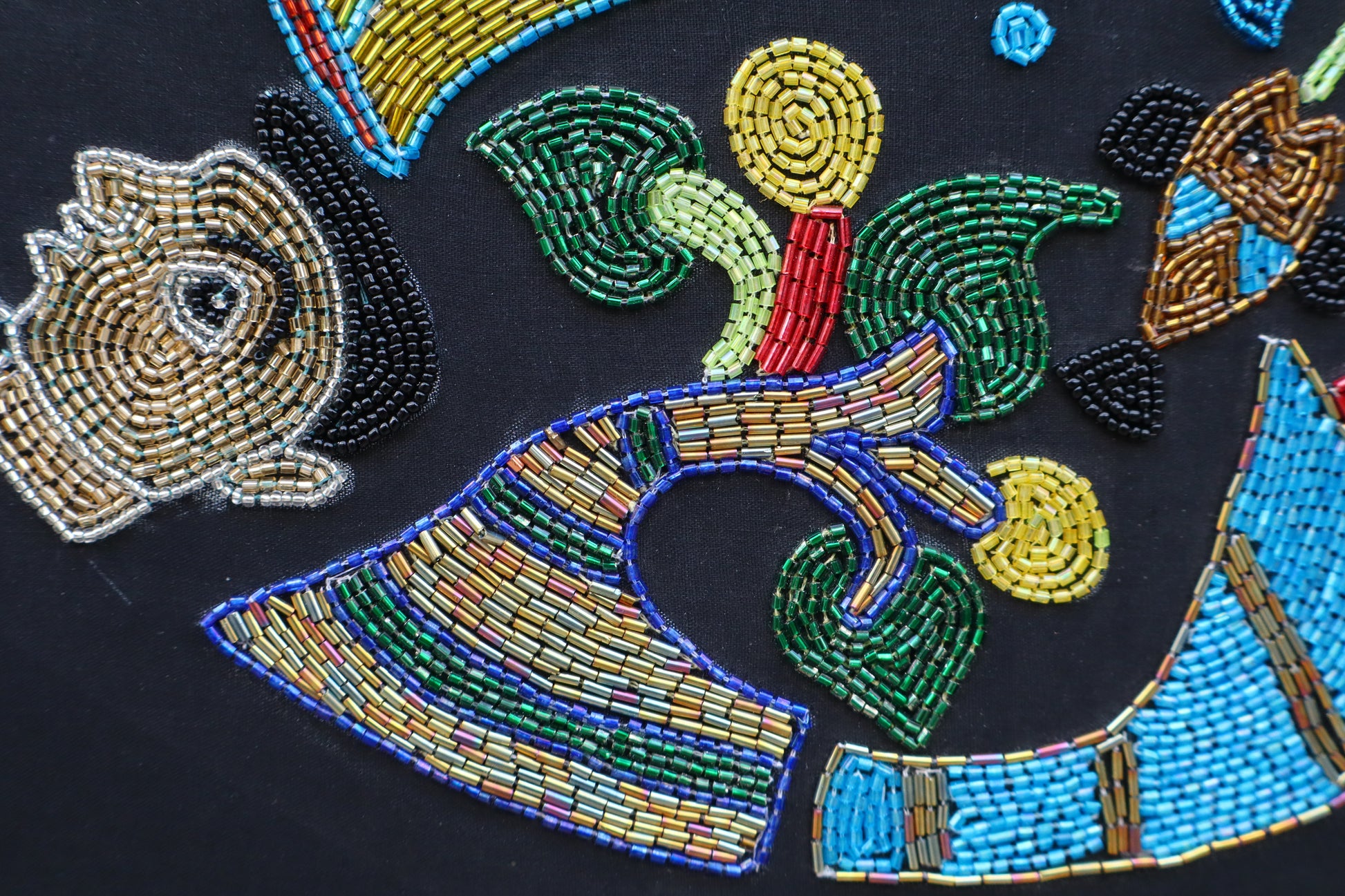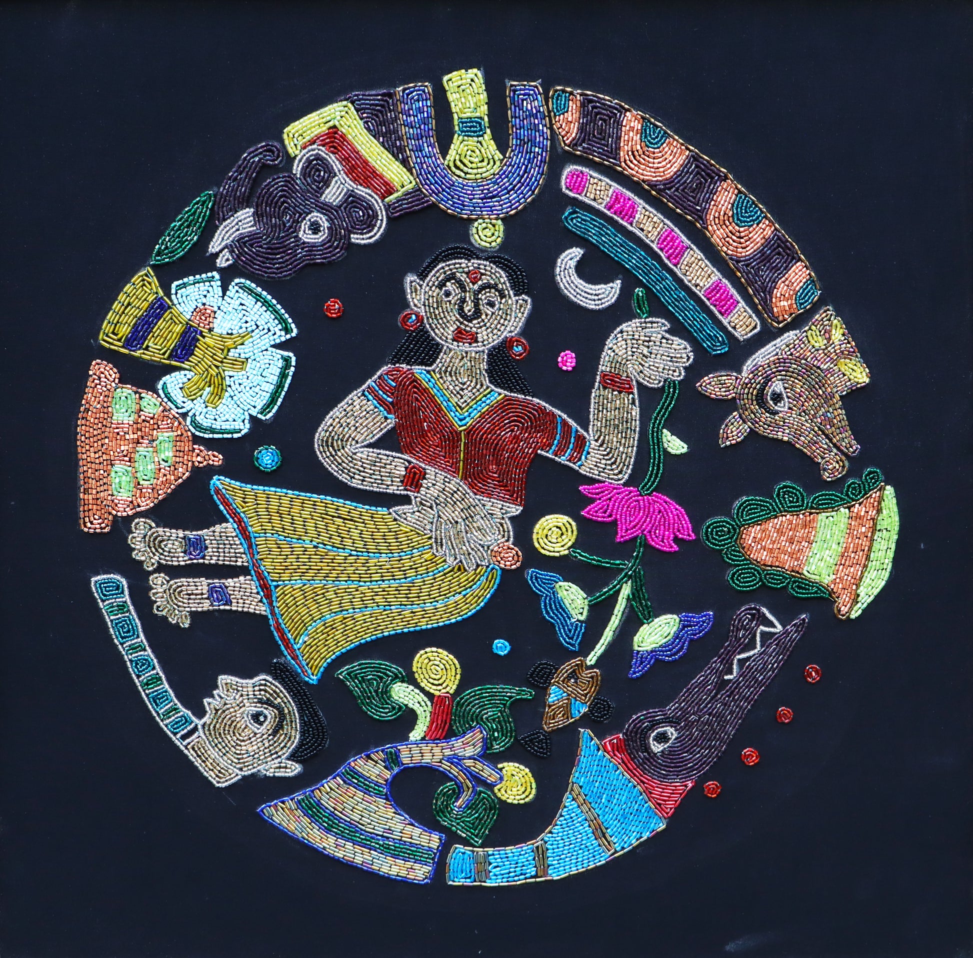 “In this Aari embroidery piece titled Dream Circle, I’ve woven together fragments from my travels — ancient forts and palaces that echo the rich heritage of South India. Alongside them, birds, animals, and even tiny insects emerge, as if drawn from the quiet corners of my dreams. The deep black background mirrors that suspended, weightless moment in sleep — when the mind drifts and images begin to float in gentle circles.”