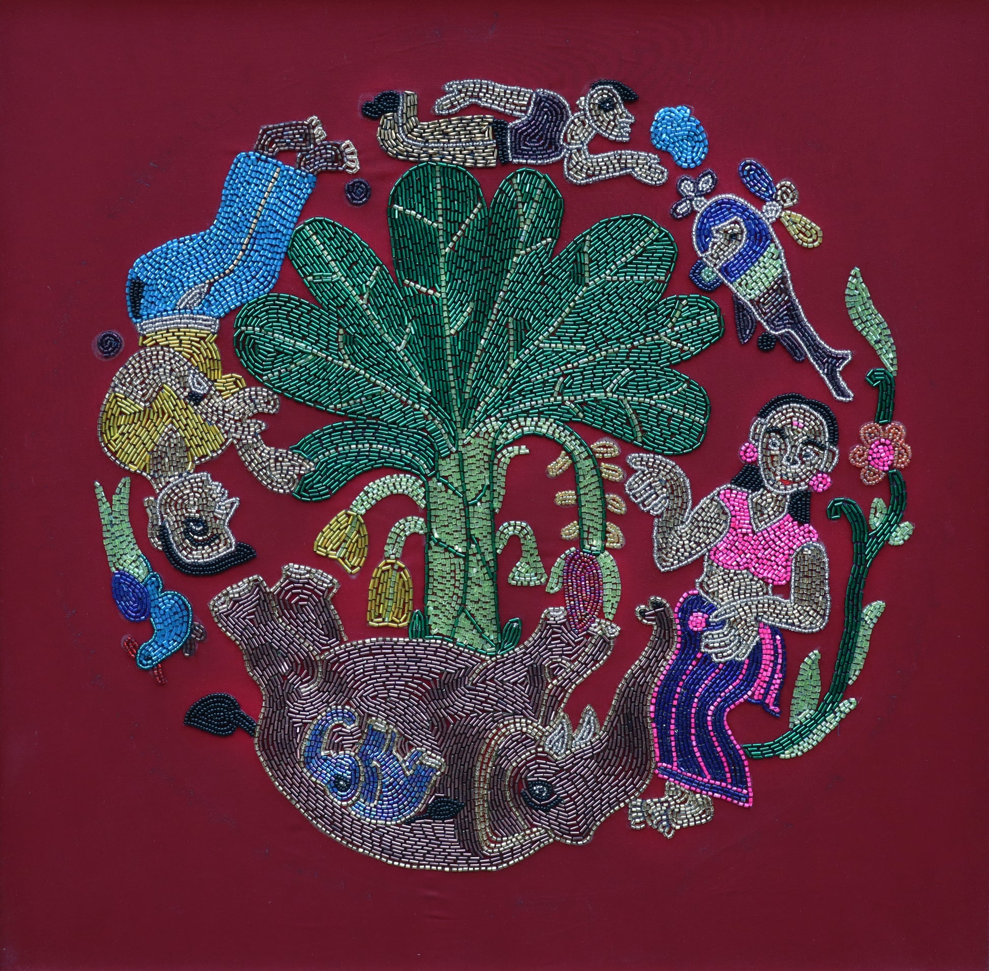 “In the grand temple traditions of South India, elephants hold a sacred and iconic presence. During festival times, their graceful, devotional walk feels like a moving dream — majestic, rhythmic, and full of spiritual energy. The temple entrances are beautifully adorned with plantain trees, adding to the festive aura and cultural richness. This Aari work captures that vibrant moment, weaving together the ceremonial grandeur of elephants, the decorative beauty of the setting, and the harmonious presence of both humans and animals. It is a tribute to the deep-rooted traditions that continue to inspire my imagination.”