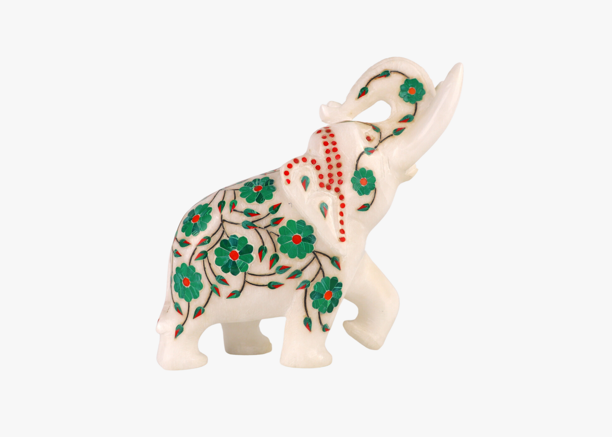 In the Hindu faith elephants are a sacred animal, symbolising many things, amongst which are dignity, wisdom, intellectual strength, earthly power and family ties. With its trunk held high, this sacred animal holds strength and wisdom that is highly revered. Known to bring prosperity and good fortune into homes, an elephant is the perfect energetic ally in your workspace, meditation space, or learning/knowledge corner. Carved in white marble and encrusted with radiant semi-precious gemstone floral detailing, this elephant is one of a kind.