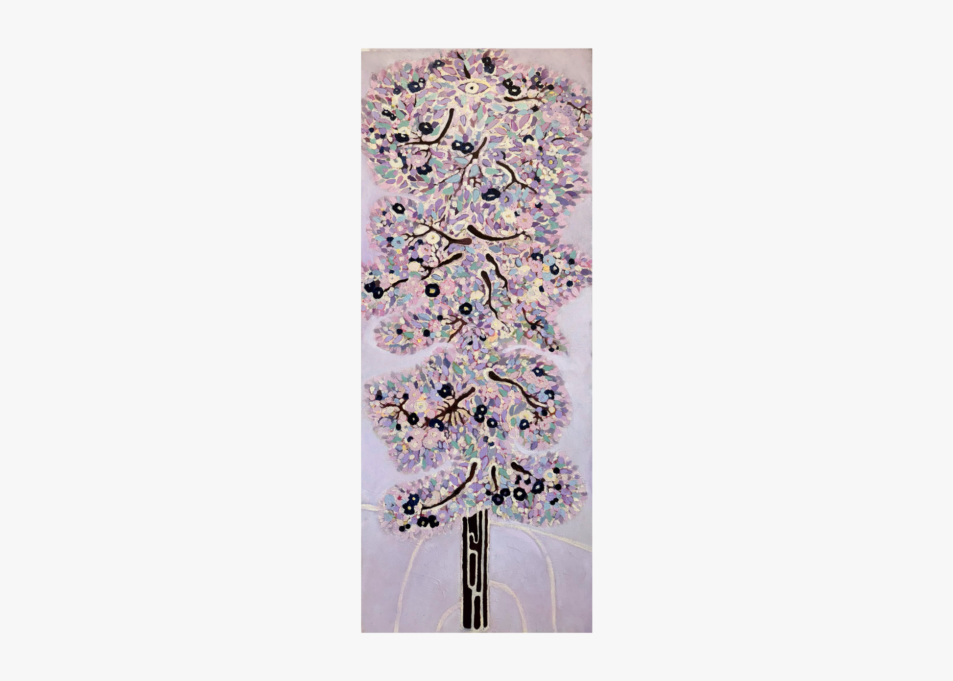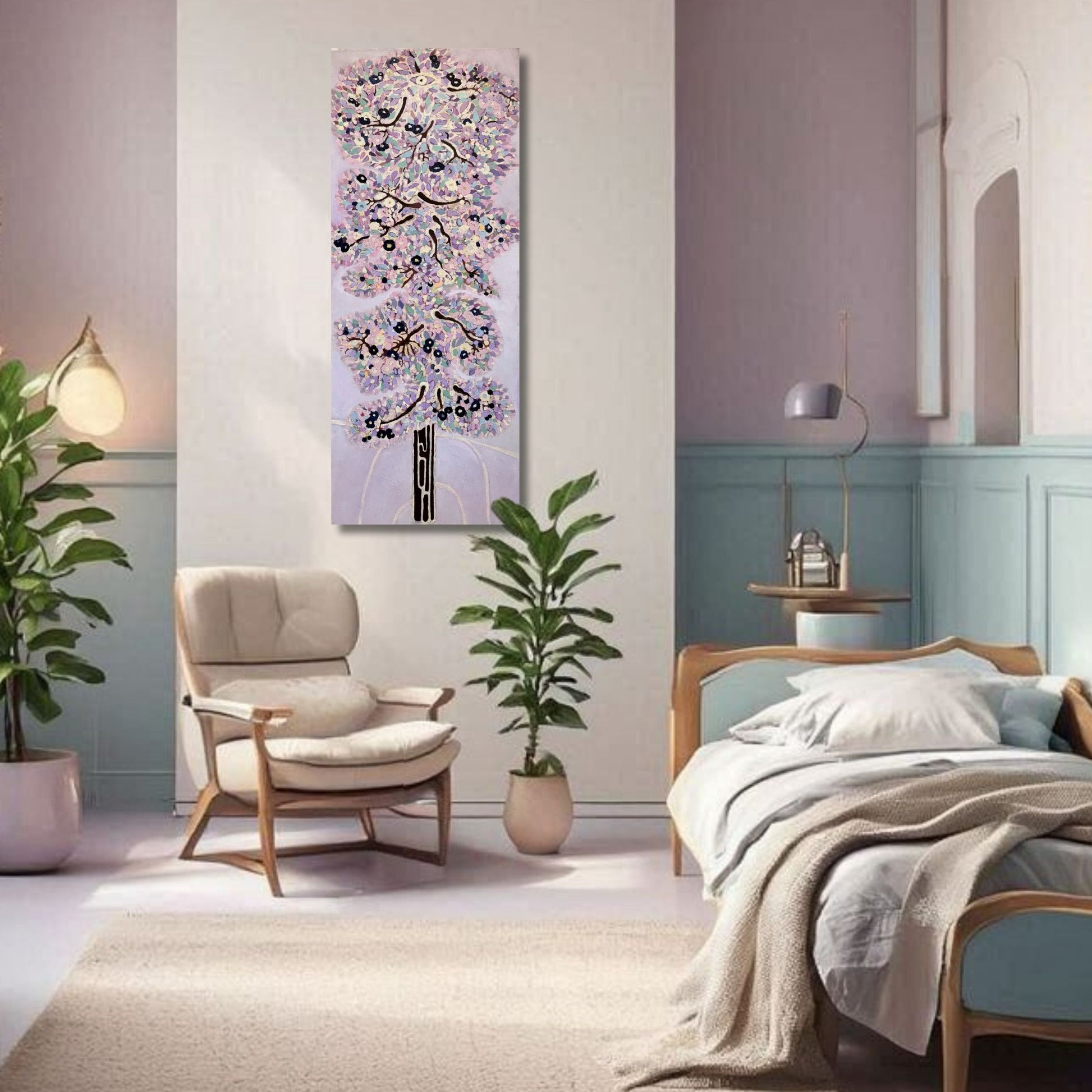This work unfolds from the soft imprints of eucalyptus leaves, bark, and flowers, forming a ground that feels like a dormant garden awaiting dawn. Painted blossoms begin to