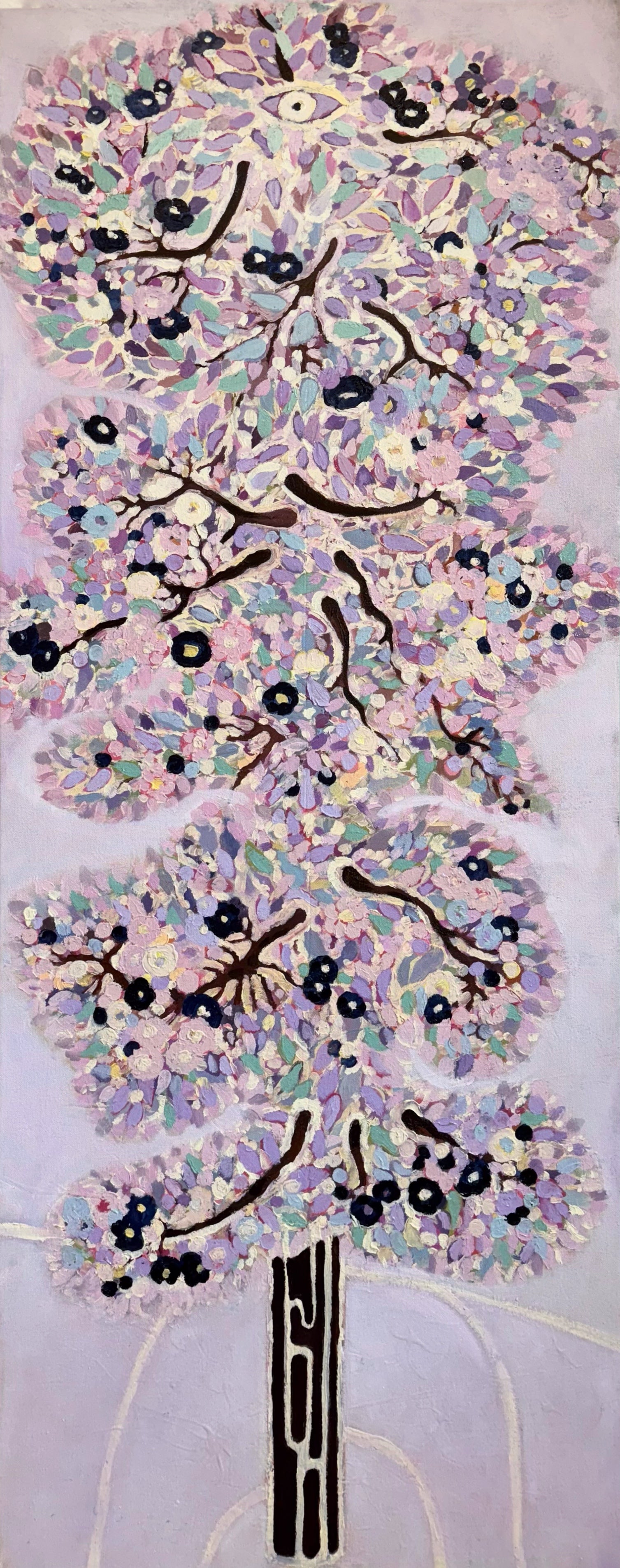 surface through the eco-printed textures—lavenders, golds, pale blues—mirroring the slow arrival of morning light. At the top, a single eye appears as an emblem of recognition rather than judgement. The piece captures the quiet moment when hope returns, almost imperceptibly at first, reminding us that growth continues even through periods of dimness.