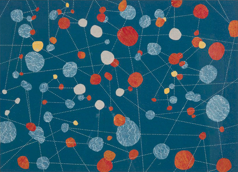 Medium: Woodblock on Hosho paper, pen, and collage on Stonehenge paper