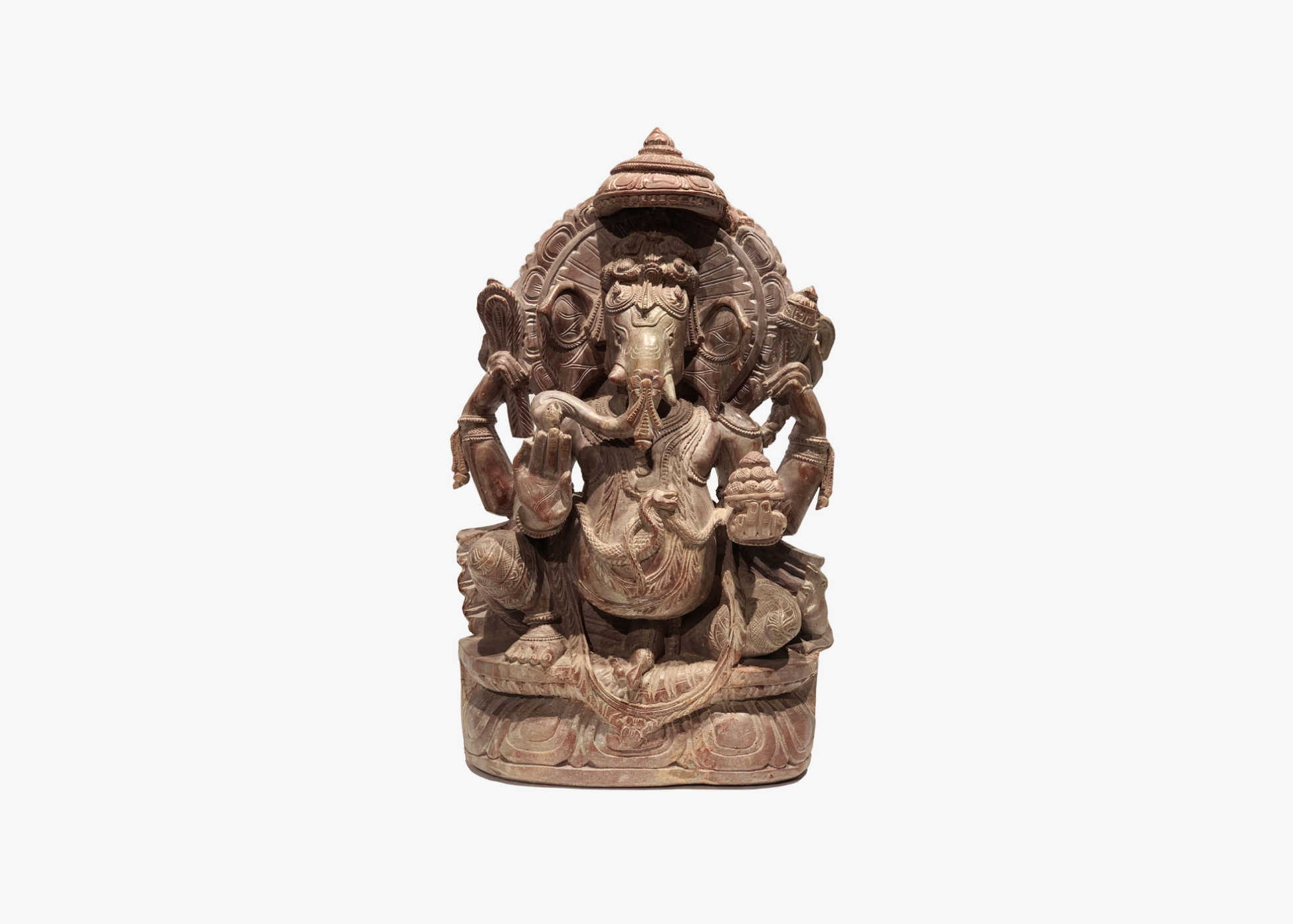 Lord Ganesh sits above a supporting lotus in the Lalitasana position or “royal ease”. His large ears extend forward intently with the capacity to listen and assimilate ideas. A halo surrounds Ganesh’s head indicating the sacredness of this revered god. He is portrayed with four arms, each representing the four realms of beings including the sea, land, water and air. The medium of soft stone compliments the detailed carving resonating its own pattern of marble tones including earthy reds and umber.