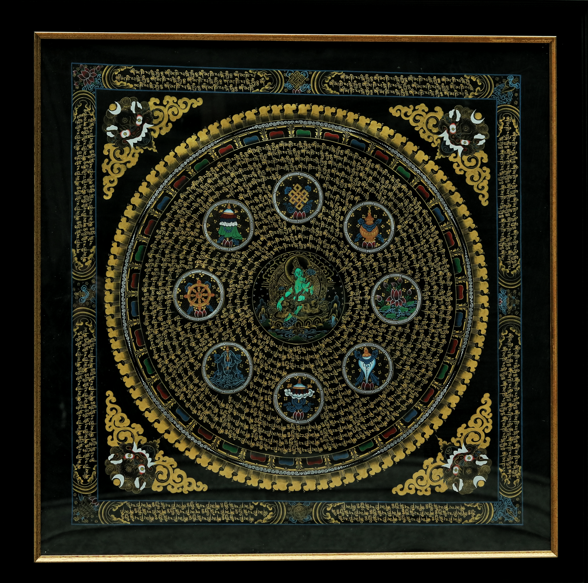Inscribed with the mantra of compassion - Om Mani Padme Hum - this mandala reveals Green Tara sitting in the very centre.
