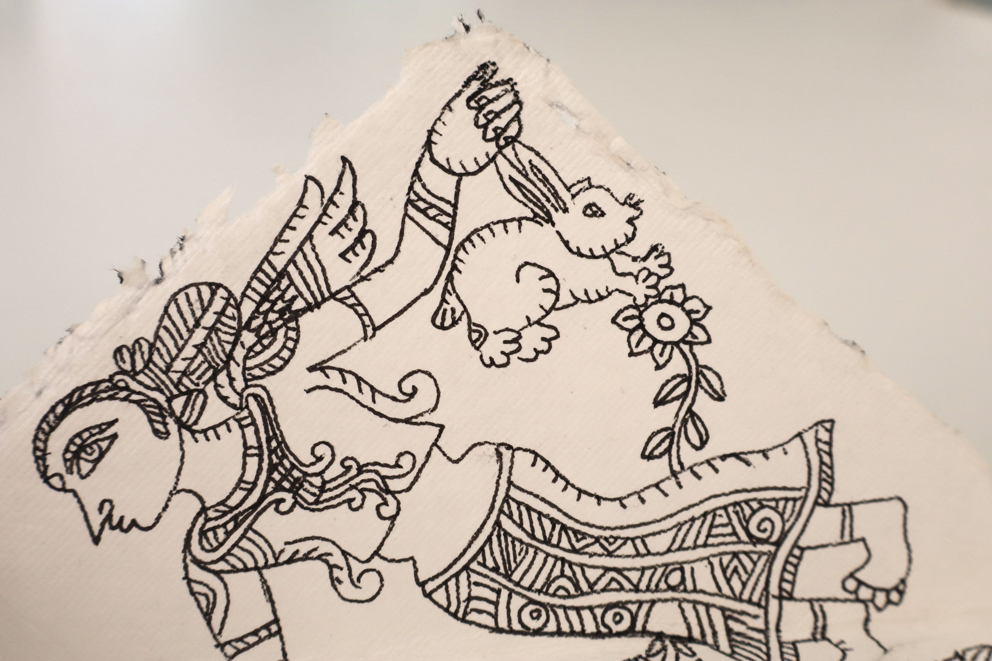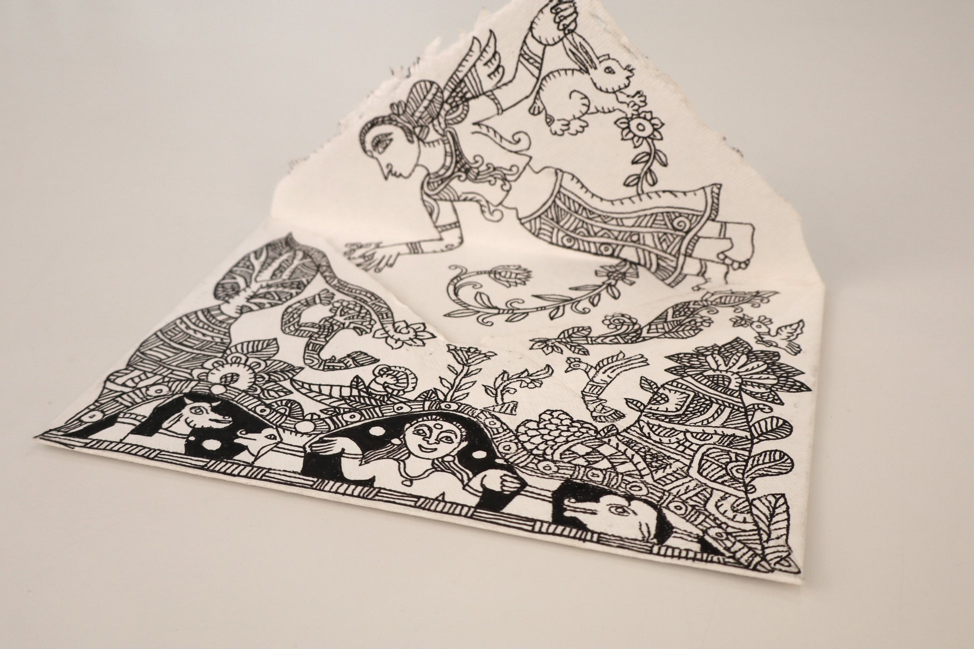 This series of envelopes, crafted from handmade paper and richly decorated, draws on Hindu cosmology and the visual language of South Indian folk art. Through intricate motifs and vibrant detail, Narendrababu transforms everyday objects into symbolic surfaces, reimagining timeless narratives through his own contemporary design language.