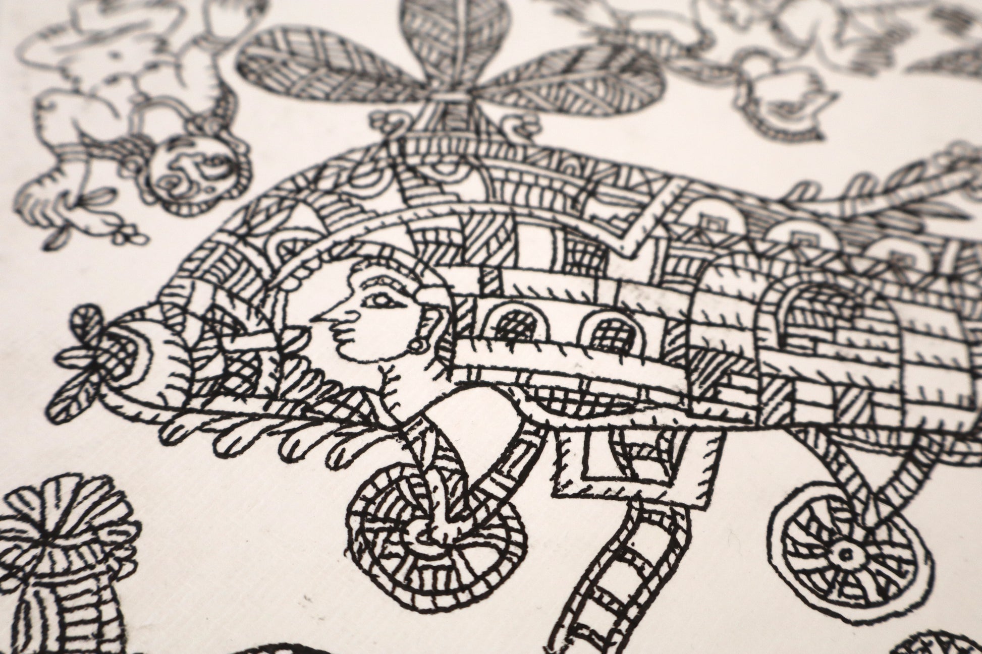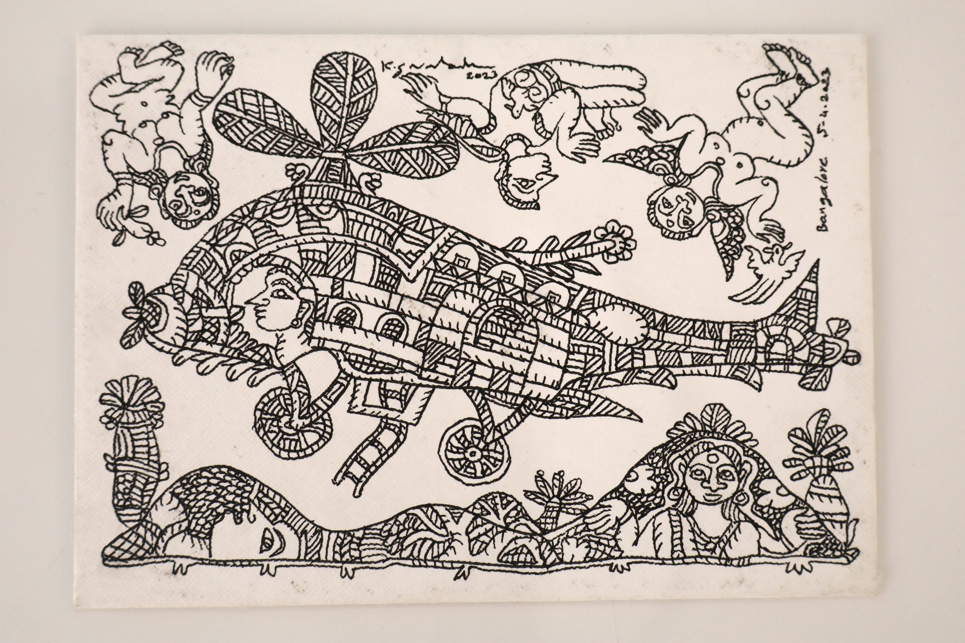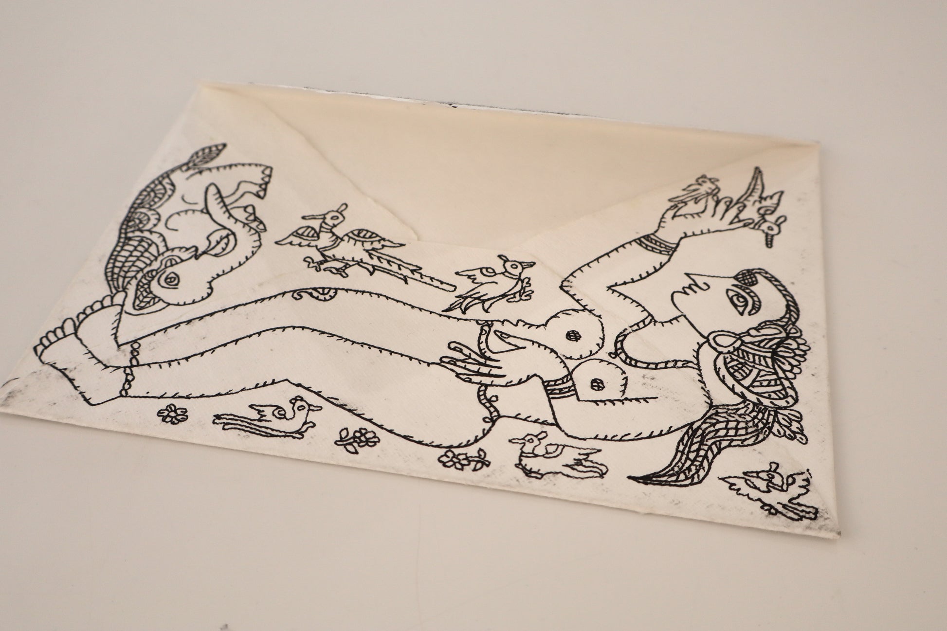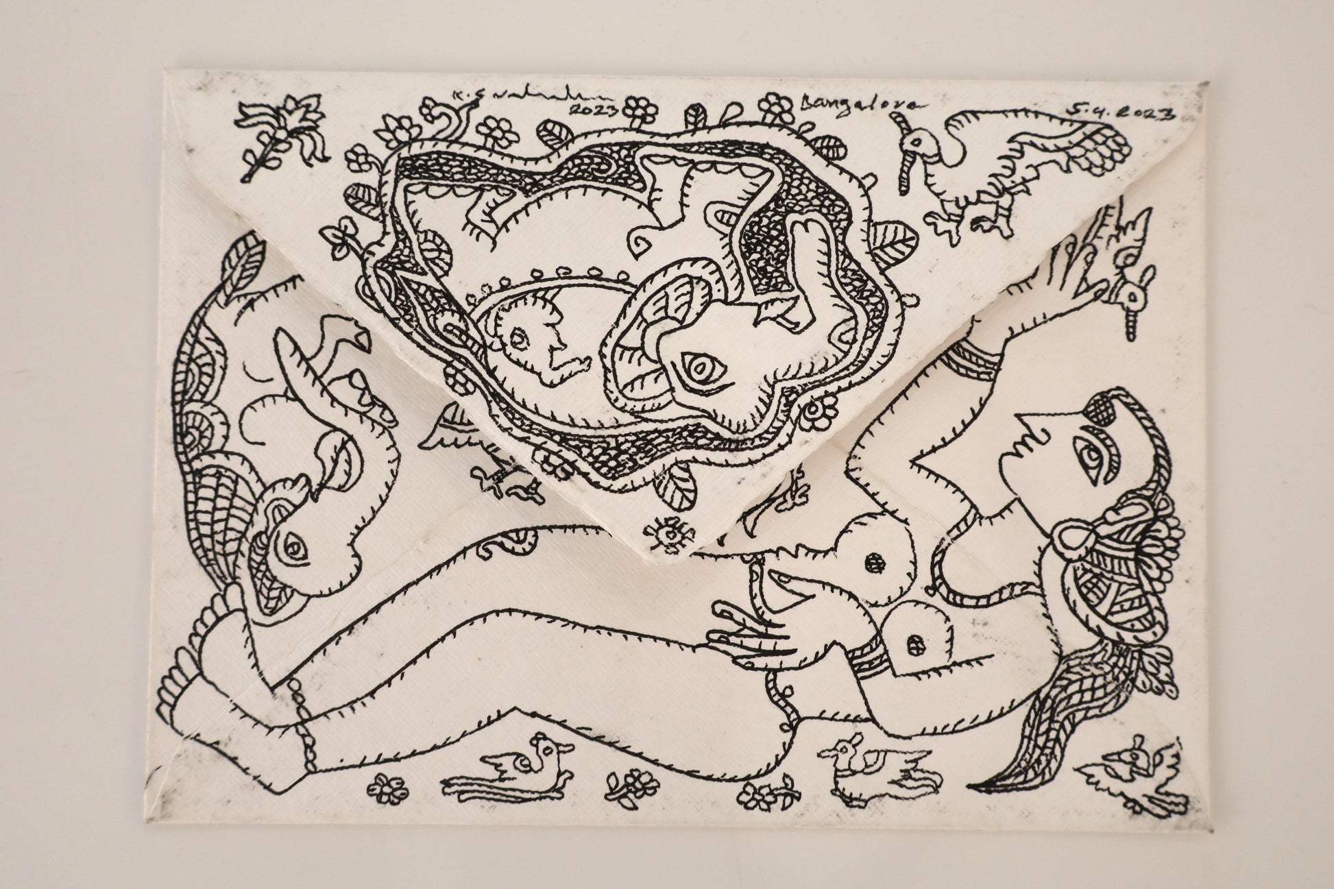 This series of envelopes, crafted from handmade paper and richly decorated, draws on Hindu cosmology and the visual language of South Indian folk art. Through intricate motifs and vibrant detail, Narendrababu transforms everyday objects into symbolic surfaces, reimagining timeless narratives through his own contemporary design language.