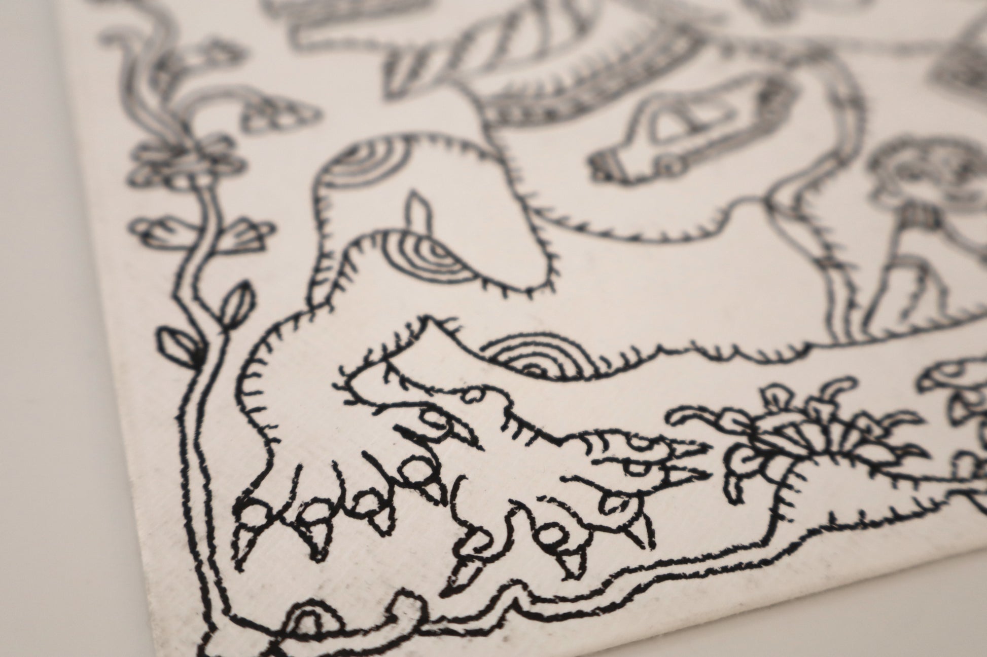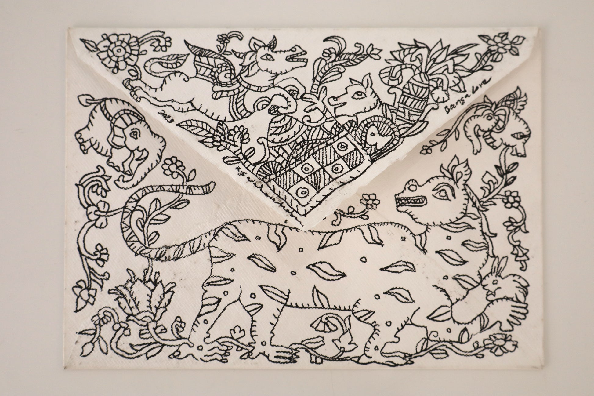 This series of envelopes, crafted from handmade paper and richly decorated, draws on Hindu cosmology and the visual language of South Indian folk art. Through intricate motifs and vibrant detail, Narendrababu transforms everyday objects into symbolic surfaces, reimagining timeless narratives through his own contemporary design language.