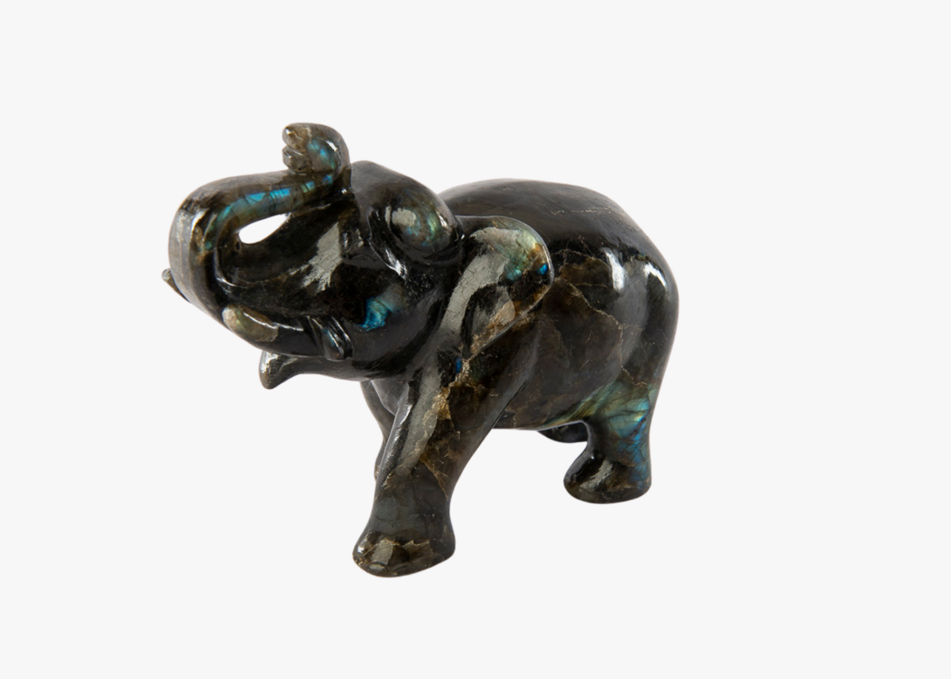 This stunning elephant by Ram Kumar is carved in Labradorite, the stone of protection, travel and psychic abilities. The curves of the animal showcase the blue and golden flames of labradorite beautifully, as they are illuminated by light, glowing differently from every angle. In the Hindu faith elephants are a sacred animal, symbolising dignity, wisdom, intellectual strength, earthly power and family ties. In this piece the subject and material are married, bringing to your space an energy of travel, adventure, protection, grounding and visionary experiences.