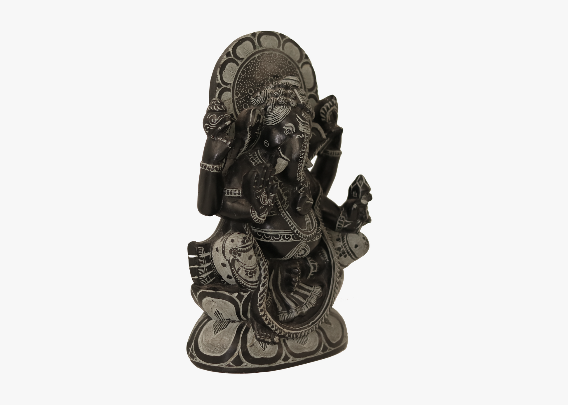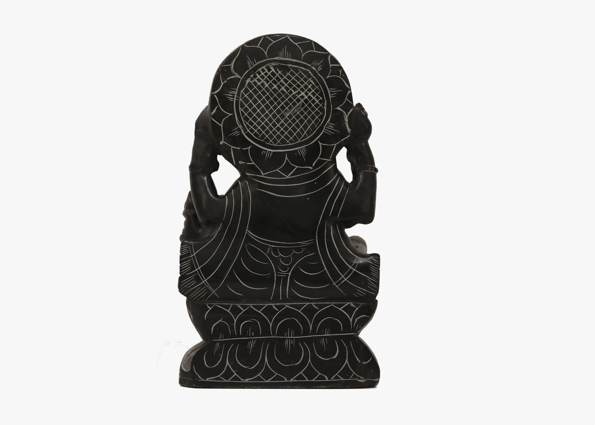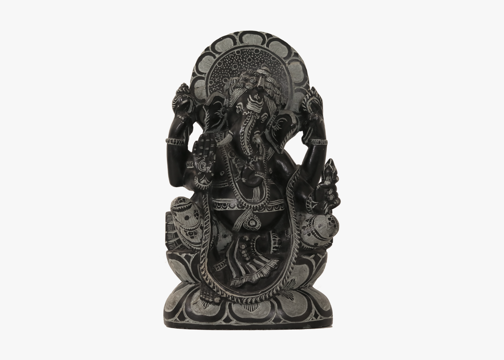 A marvellously intricate work by R. Mani, this Ganesha in granite captures the gaze and gives the onlooker a world of detail to get lost in. Lord Ganesha is one of the most widely worshipped Hindu gods, popularly known as the remover of obstacles. This piece is full of symbolism, as are most depictions of Hindu deities. Ganesh is holding a flower in his lower left hand, symbolising the highest goal of human evolution and the sweetness of the true inner self. The sound of blowing into the conch shell held in his upper right hand helps keep the evil and negative thoughts away. His bottom right hand is raised in a mudra that represents blessing. Ganesha’s big belly is said to represent the whole Universe, and the peaceful digestion of the good and the bad in life. One of the explanations for his broken tusk is that of symbolising non-duality.