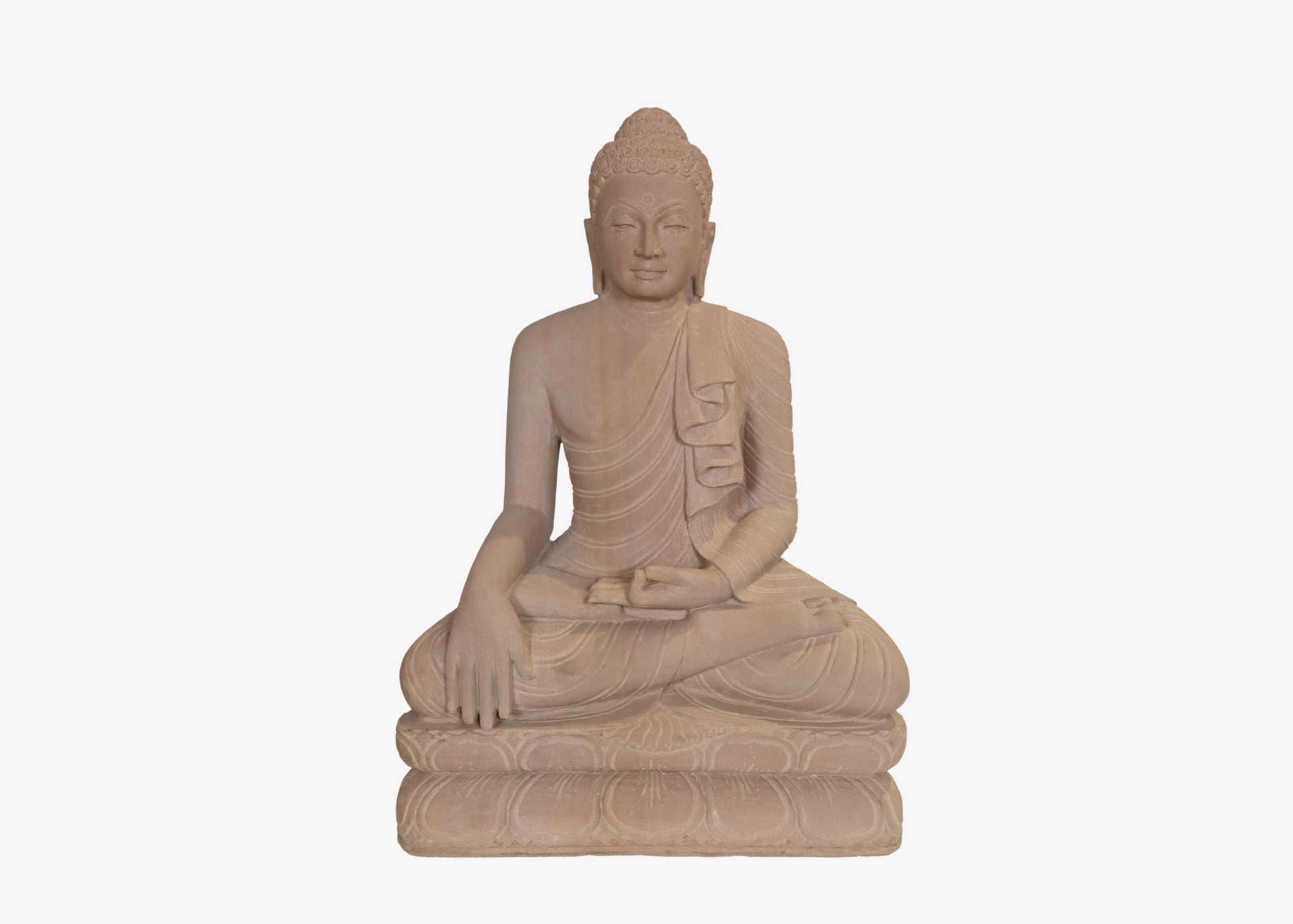Sitting Buddha in Bhumiparsha mudra handmade by award wining artist R. Mani in Sandstone. The Buddha is sitting on top of a lotus flower, symbol of purity and bliss, marking his Enlightened Presence.Bhumiparsha is an iconic hand gesture. Also known as earth touching, it marks the moment Buddha attained enlightenment, sitting under the Bhodi tree in Bodh Gaya, North India. Handmade from sandstone, the artist shows most intricate details of the drapery flowing down Buddha's body, the ushishna crown, the curls on his head, as well as his elongated ears.