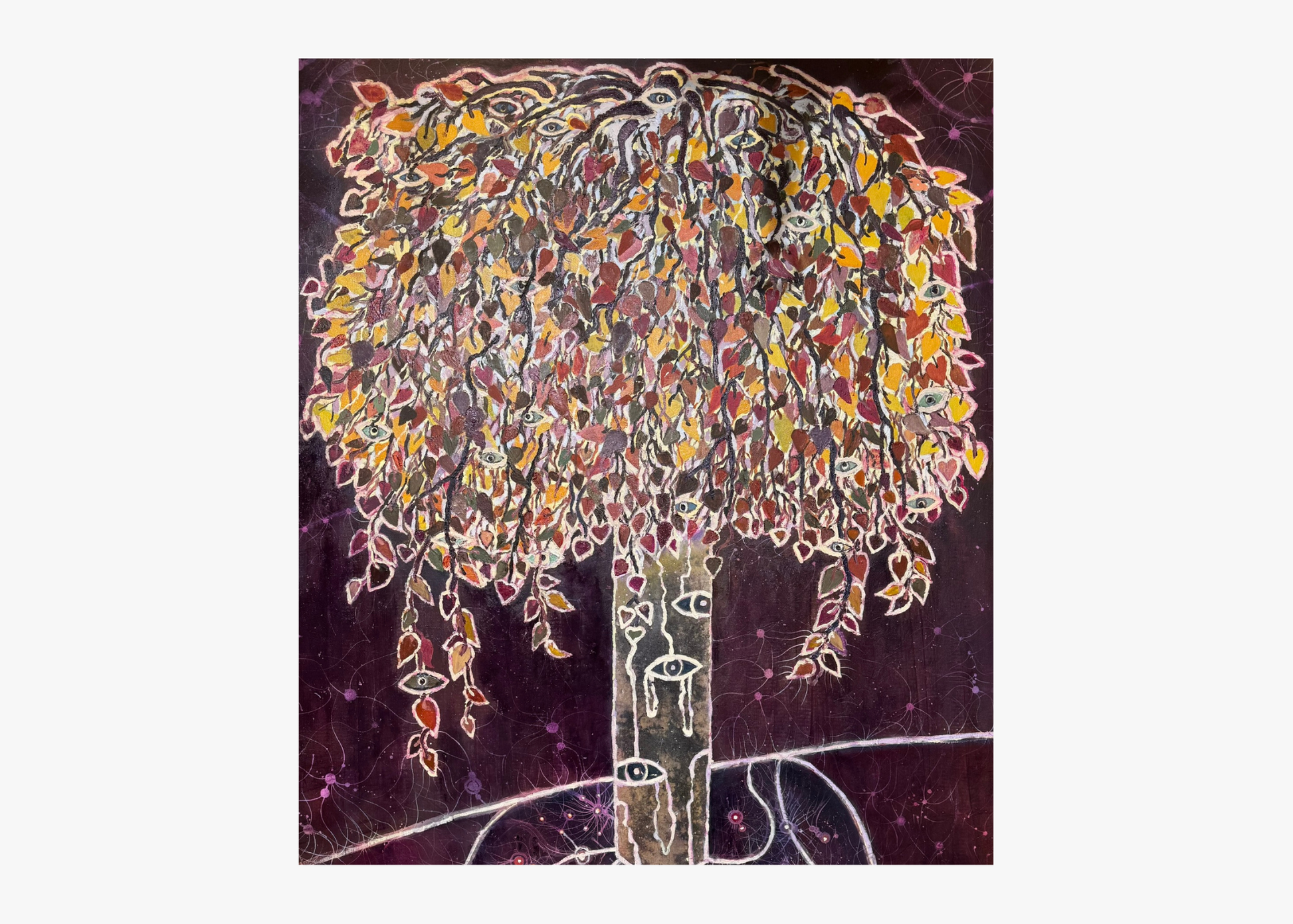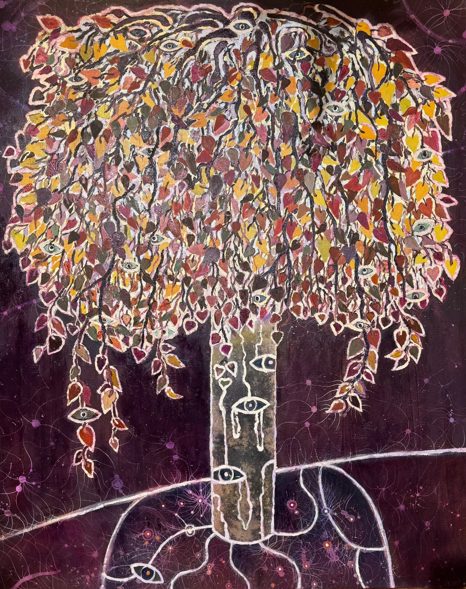 Guardian Tree (Autumn / West) emerged from a desire to honour the season of endings. Burnt gold leaves, deep earth tones, and the invisible mycelium threads beneath the surface all spoke of decay as a sacred teacher. This tree stands watch—guarding, witnessing, and holding the wisdom of what is falling away.